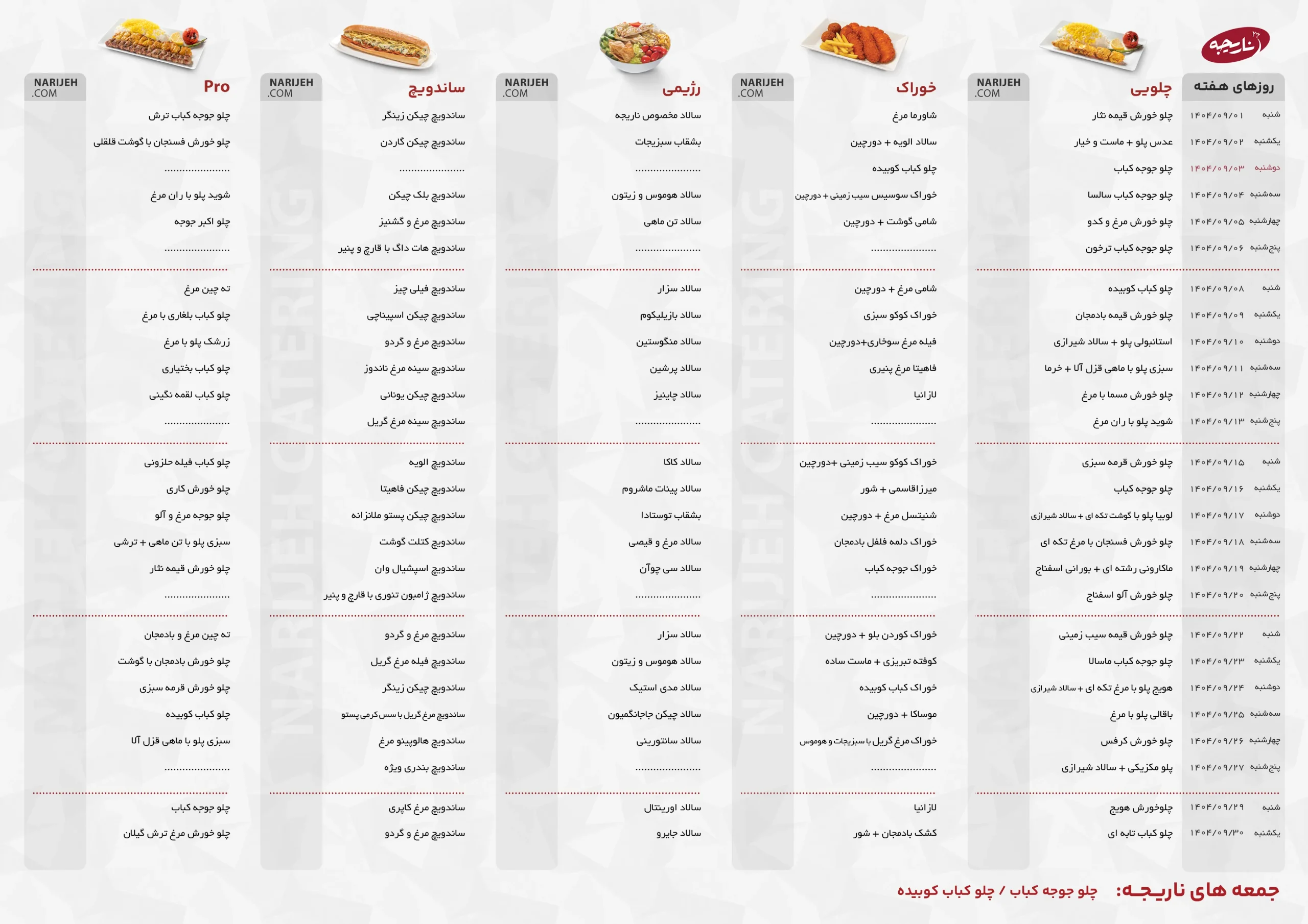 ناریجه سعی دارد لیستی از غذاهای محبوب را تهیه کند تا نیاز همه مشتریها رفع شود. در این لیست نام خوراکیهایی را میبینید که شاید فقط عده کمی آنها را بپسندند؛ اما ناریجه برای رفع نیاز مشتریهای خاصپسند این غذاها را به منو اضافه کرده است.