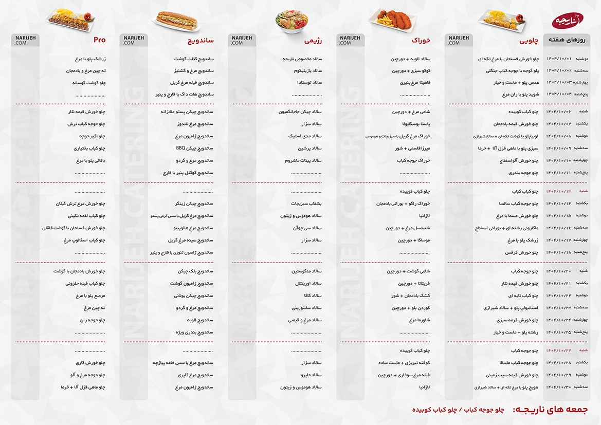ناریجه سعی دارد لیستی از غذاهای محبوب را تهیه کند تا نیاز همه مشتریها رفع شود. در این لیست نام خوراکیهایی را میبینید که شاید فقط عده کمی آنها را بپسندند؛ اما ناریجه برای رفع نیاز مشتریهای خاصپسند این غذاها را به منو اضافه کرده است.